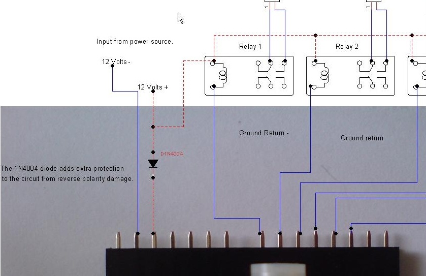 In the photo below you can see I have added a simple diode 1N4004 into the power line of the 12 volt + supply this helps protect the circuit from reverse polarity damage.
