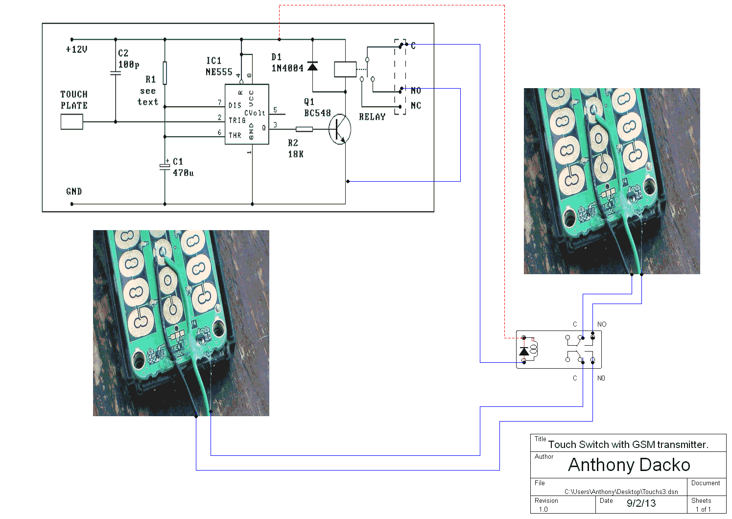 The schematic above is from the Quasar electronics kit touch switch click here the modification below shows how to add a modified mobile phone to the circuit or two mobile phones using a second relay.